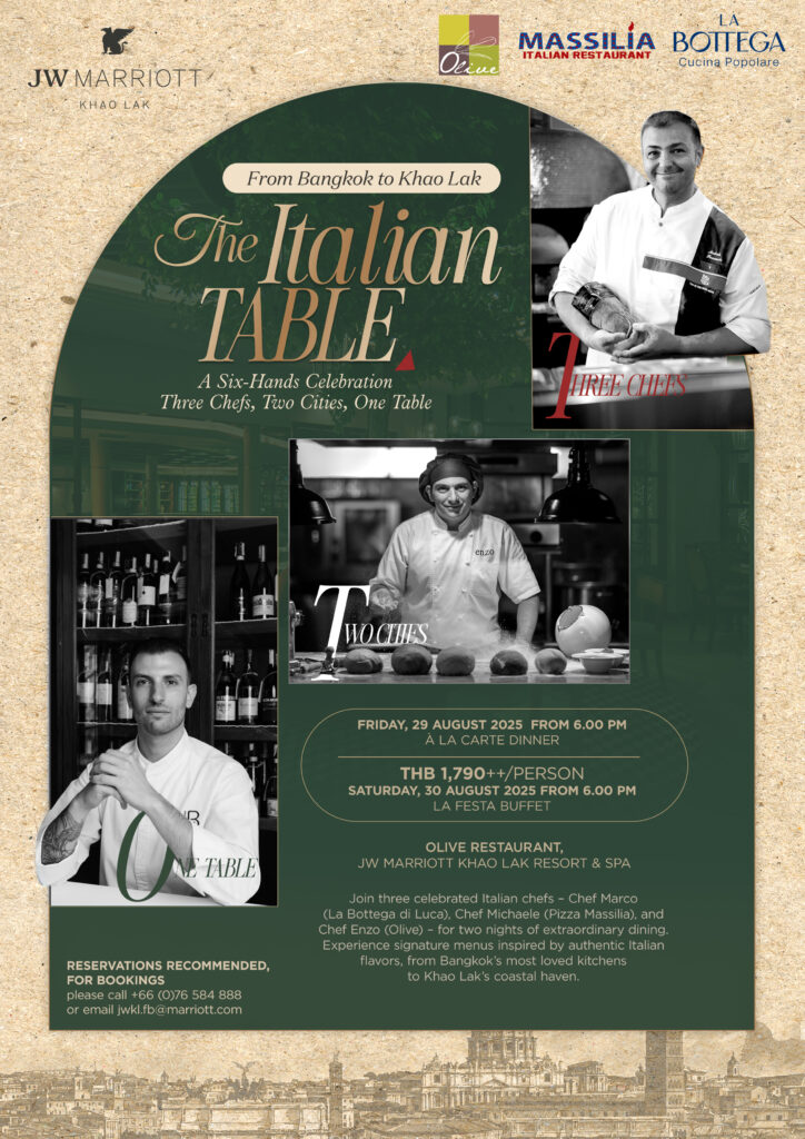 เจดับบลิว แมริออท เขาหลัก รีสอร์ท แอนด์ สปา จุดหมายปลายทางด้านอาหารชั้นนำของเขาหลัก ภูมิใจนำเสนอ The Italian Table ดินเนอร์สุดพิเศษ 2 คืน ที่รวบรวมเชฟอิตาเลียนชั้นนำ 3 ท่านของประเทศไทย มาร่วมรังสรรค์มื้อค่ำอันน่าประทับใจและเปี่ยมด้วยเสน่ห์แห่งรสชาติ เพียงครั้งเดียวในปีนี้