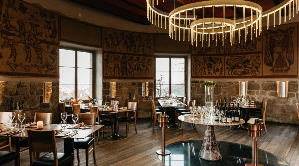ร้านอาหารชั้นเลิศภายในหอคอยธนูอายุกว่า 500 ปี ที่ผสานรสชาติร่วมสมัยกับแรงบันดาลใจจากตำรับอาหารยุโรปยุคกลาง เชฟ Igor Jagodic ผู้คว้ารางวัล Michelin Plate และ Gault & Millau คัดสรรวัตถุดิบท้องถิ่นมารังสรรค์เมนูอย่างประณีต ท่ามกลางวิวพาโนรามาของเมืองลูบลิยานา มีเมนู Signature อย่าง “Wild Game Trilogy” ที่ใช้เนื้อกวาง หมี และหมูป่าจากป่าสโลวีเนีย นำเสนอในสามสไตล์การปรุงที่ต่างยุคสมัย หรือ “Medieval Honey Cake” ของหวานที่ปรับสูตรจากเอกสารประวัติศาสตร์ศตวรรษที่ 14 แต่ละจานถูกเสิร์ฟบนเครื่องกระเบื้องที่ออกแบบพิเศษโดยศิลปินท้องถิ่น พร้อมไวน์คัดสรรจากห้องไวน์ใต้หอคอยซึ่งมีอุณหภูมิเหมาะสมที่สุดสำหรับการเก็บรักษา
