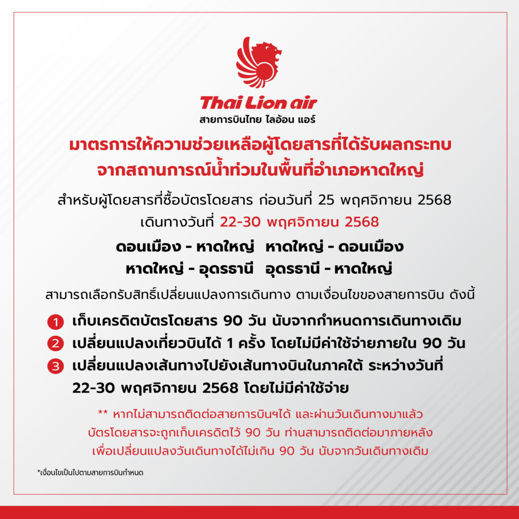 สายการบินไทย ไลอ้อน แอร์ ออกมาตรการต่อเนื่องจากสถานการณ์น้ำท่วมในพื้นที่หาดใหญ่ จังหวัดสงขลา สำหรับผู้โดยสารที่ซื้อบัตรโดยสาร ก่อนวันที่ 25 พฤศจิกายน 2568 เดินทางวันที่ 22-30 พฤศจิกายน 2568 เส้นทางบิน ดอนเมือง-หาดใหญ่ หาดใหญ่-ดอนเมือง หรือ หาดใหญ่-อุดรธานี อุดรธานี-หาดใหญ่ ** หากไม่สามารถติดต่อสายการบินฯได้ และผ่านวันเดินทางมาแล้ว บัตรโดยสารจะถูกเก็บเครดิตไว้ 90 วัน ท่านสามารถติดต่อมาภายหลัง เพื่อเปลี่ยนแปลงวันเดินทางได้ไม่เกิน 90 วัน นับจากวันเดินทางเดิม สามารถเลือกรับสิทธิ์เปลี่ยนแปลงการเดินทางตามเงื่อนไขของสายการบิน ผ่านศูนย์บริการลูกค้าสัมพันธ์หรือติดต่อผ่านเคาน์เตอร์จำหน่ายบัตรโดยสารของสายการบินทุกสถานี ดังนี้เก็บเครดิตบัตรโดยสาร 90 วัน นับจากกำหนดการเดินทางเดิมเปลี่ยนแปลงเที่ยวบินได้ 1 ครั้ง โดยไม่มีค่าใช้จ่ายภายใน 90 วันเปลี่ยนแปลงเส้นทางไปยังเส้นทางบินในภาคใต้ ระหว่างวันที่ 22-30 พฤศจิกายน 2568 โดยไม่มีค่าใช้จ่าย *ไม่มีบริการรถรับ-ส่ง ในกรณีเปลี่ยนแปลงเส้นทาง*หากมีการเปลี่ยนการเดินทางในช่วงวันหยุดนักขัตฤกษ์หรือวันหยุดยาว ผู้โดยสารจะต้องชำระส่วนต่างค่าโดยสาร(ถ้ามี)แต่จะไม่มีการเก็บค่าธรรมเนียมการเปลี่ยนแปลง*เงื่อนไขเป็นไปตามที่สายการบินกำหนด ช่องทางในการติดต่อสอบถามThai Lion Air Contact Center Line official account @lionairgroup หรือ โทร 02 – 529 – 9999 หรือ เคาน์เตอร์จำหน่ายบัตรโดยสารของสายการบินทุกสถานี