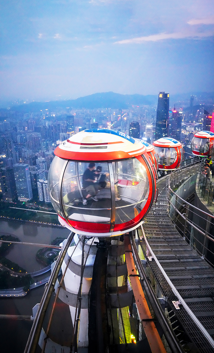 ขึ้นลิฟต์สู่ยอด Canton Tower ชมวิวเมืองกวางโจวและแม่น้ำเพิร์ลแบบเต็มตาจากมุมสูง มองเห็นแสงสีและความเคลื่อนไหวของเมืองอย่างชัดเจน พร้อมลิ้มรสเมนูเด็ดของภัตตาคาร Colour Canton ที่เสิร์ฟเป็ดปักกิ่งมาพร้อม QR code ให้ติดตามเรื่องราวของวัตถุดิบ แต่ละมื้อจะยิ่งพิเศษเมื่อคุณนั่งรอบบานกระจก มองวิวเมืองแบบพาโนรามา 360 องศา