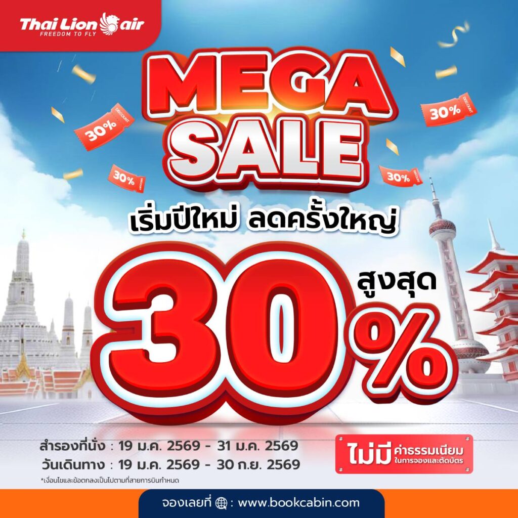 สายการบินไทย ไลอ้อน เเอร์ จัดโปรโมชันพิเศษ MEGA SALE เริ่มปีใหม่ ลดครั้งใหญ่ ลดสูงสุด 30% ทั้งเส้นทางบินในประเทศและต่างประเทศ ทั้งนี้สามารถสำรองที่นั่งได้ตั้งแต่วันที่ 19 มกราคม 2569 – 31 มกราคม 2569 และเริ่มเดินทางได้ตั้งแต่วันที่ 19 มกราคม 2569 – 30 กันยายน 2569 โดยไม่มีค่าธรรมเนียมในการจองและตัดบัตร