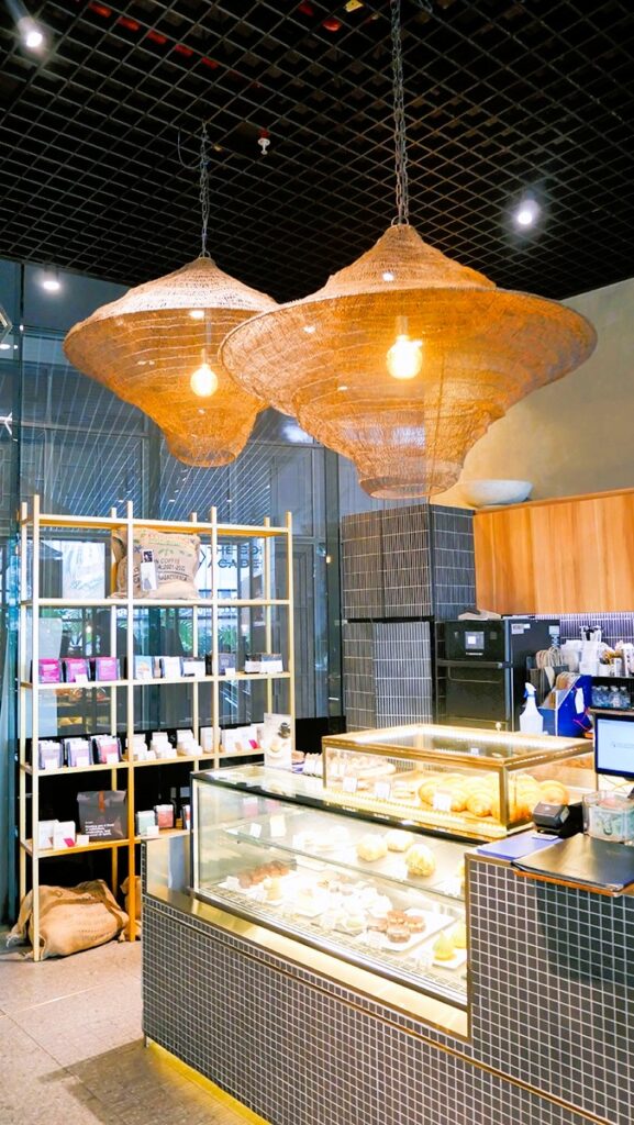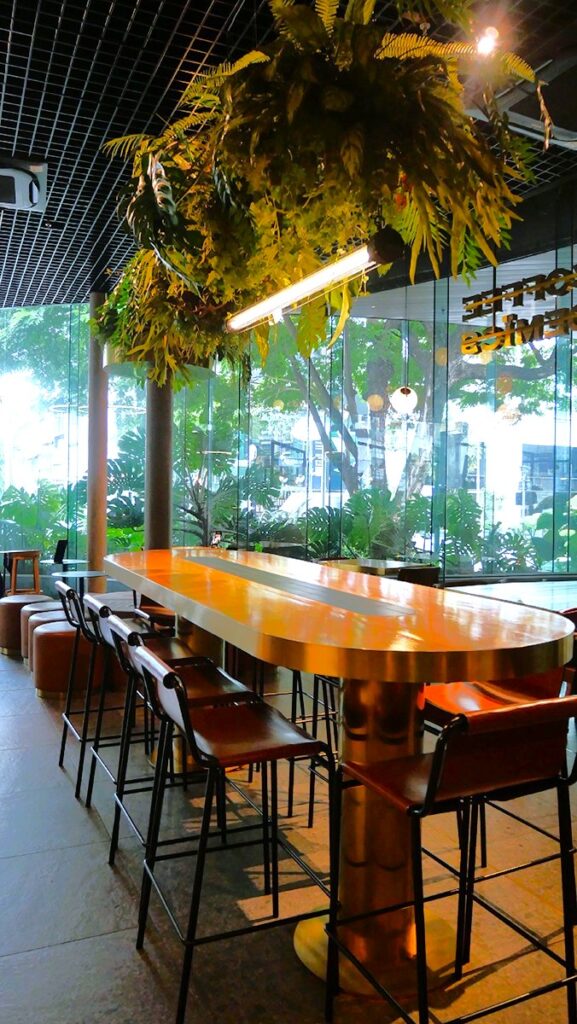 บรรยากาศภายในร้านอบอวลไปด้วยกลิ่นกาแฟและความอบอุ่นจากการตกแต่งที่ทันสมัยร่วมกับโทนสีไม้ธรรมชาติและสีเขียวจากต้นไม้ให้ความรู้สึกผ่อนคลายและสดชื่น ทุกมุมของร้านออกแบบมาเพื่อความสะดวกสบาย เหมาะสำหรับนั่งทำงานเบา ๆ พบปะเพื่อนฝูง หรือใช้เวลาสงบ ๆ กับตัวเอง นอกจากนี้ยังมีโซนที่นั่งแบบบาร์ให้ผู้มาเยือนชมการชงกาแฟแบบสด ๆ ใกล้ชิดขั้นตอนการทำ ให้ได้เห็นศิลปะและเทคนิคเบื้องหลังทุกแก้ว