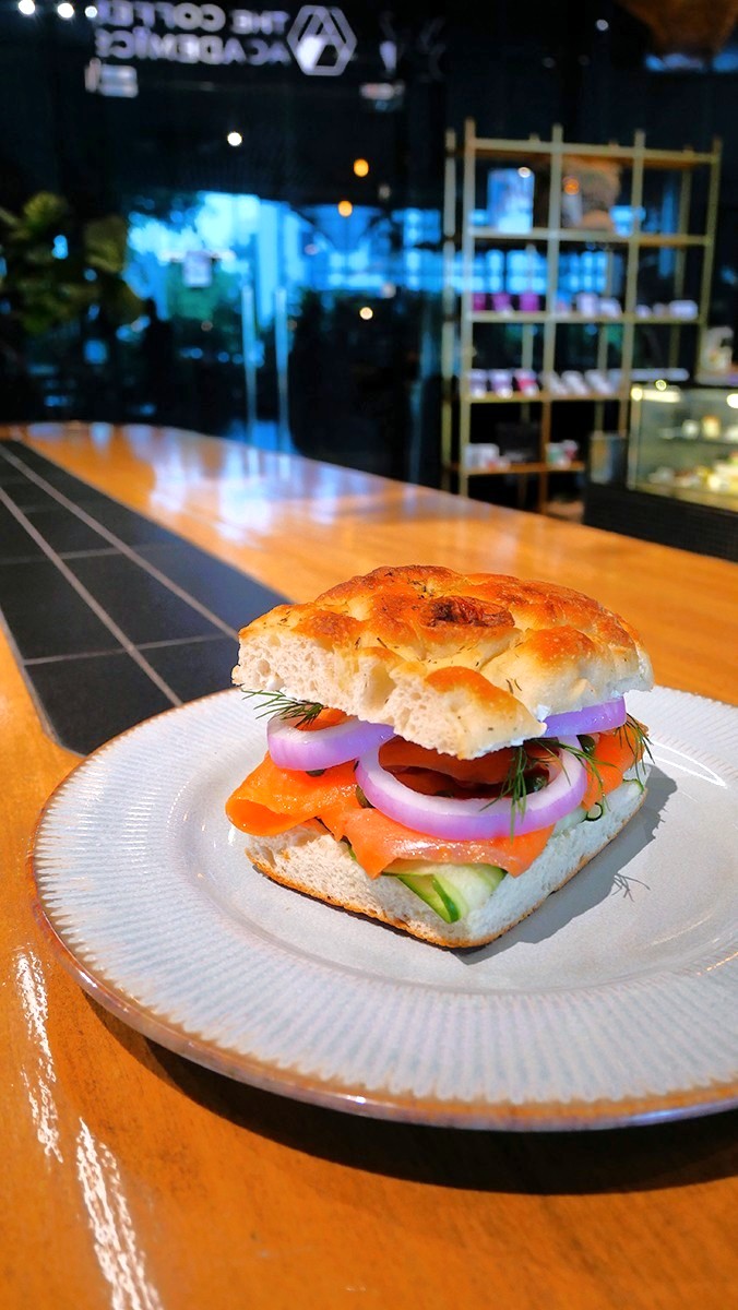 • Salmon Focaccia Sandwich ขนมปังฟอกาเซียอบกรอบ ไส้แซลมอนรมควันสด พร้อมผักสด และซอสสูตรเฉพาะของร้าน ทำให้ทุกคำเต็มไปด้วยรสชาติและเนื้อสัมผัสที่ลงตัว