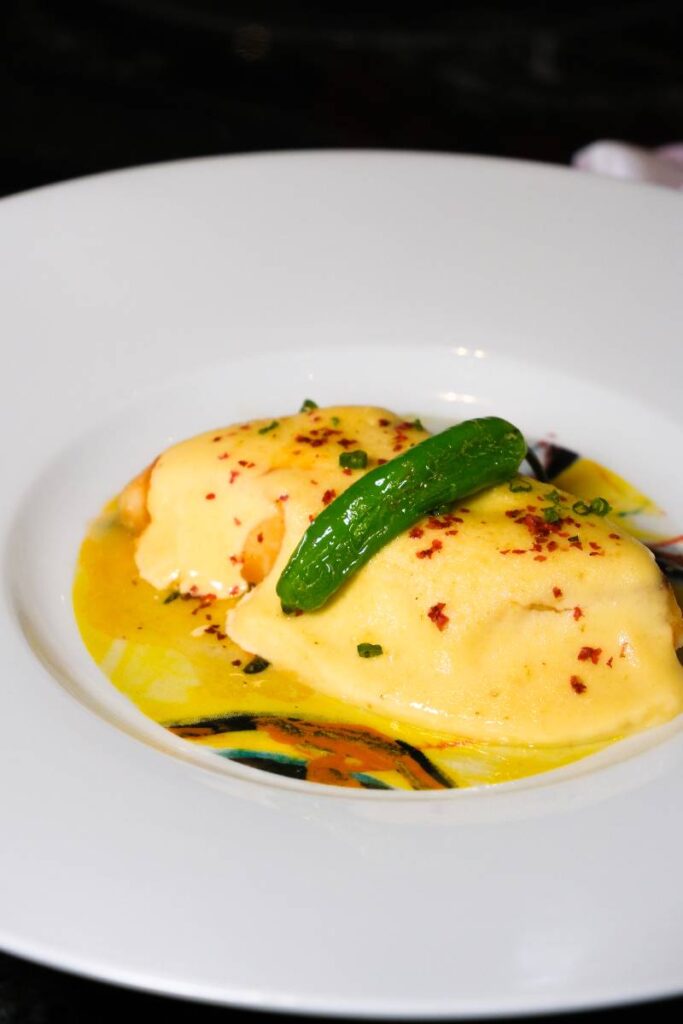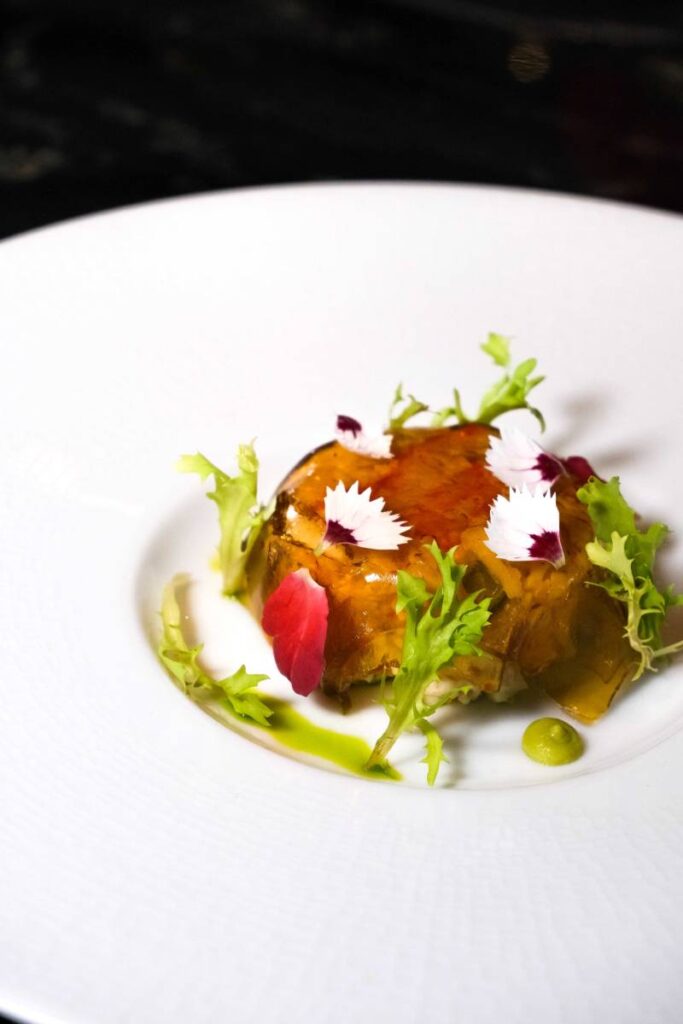 เมื่อมาถึงห้องอาหารสุดหรูบนชั้นสูงสุดของโรงแรม แขกทุกท่านจะได้ดื่มด่ำไปกับบรรยากาศสุดแสนโรแมนติก พร้อมวิวสกายไลน์กรุงเทพฯ แบบพาโนรามา ก่อนเริ่มต้นการเดินทางแห่งรสชาติด้วยเมนูเรียกน้ำย่อย King Crab Salad คิงแครบสลัด เพิ่มความสดชื่นด้วยวุ้นดาชิที่ทำจากน้ำซุปดาชิเข้มข้น เสิร์ฟพร้อมซอสมิโซะและอะโวคาโดพิวเร ต่อด้วย Crispy Tiger Prawn เทมปุระกุ้งลายเสือกรอบนอกนุ่มใน ราดมายองเนสมัสตาร์ดเหลือง และกิมบูกัก สาหร่ายโนริ