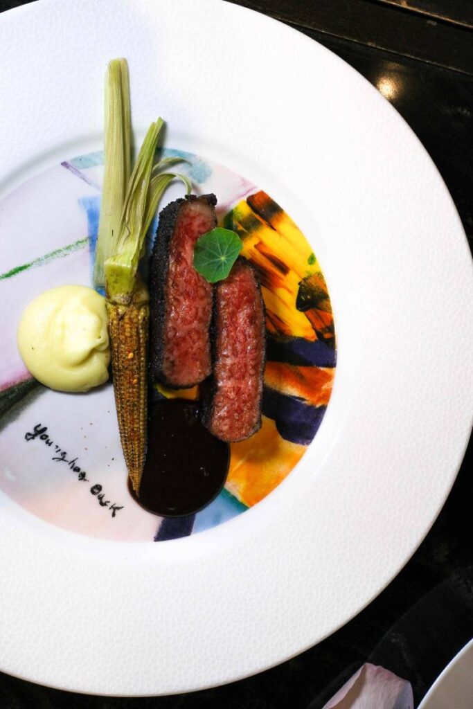 จากนั้นลิ้มลองวัตถุดิบคุณภาพเยี่ยมจากทั้งผืนดินและท้องทะเล เริ่มจากจาน Atlantic Cod ปลาค็อดแอตแลนติกเนื้อนุ่ม เสิร์ฟคู่ซอสยูซุกระเทียม เคลือบซอสน้ำผึ้งผสมมะเขือเทศ ให้รสหวานอมเปรี้ยวอย่างกลมกล่อม พร้อมพริกชิชิโตะย่างเพิ่มกลิ่นหอม ต่อด้วย Australian Striploin 2GR เนื้อสตริปลอยด์ย่างจนได้ความฉ่ำกำลังดี เสิร์ฟพร้อมซอสกระเทียมดำ ข้าวโพดอ่อนย่างไฟ และมิติรสชาติคาราเมลอ่อน ๆ อย่างลงตัว