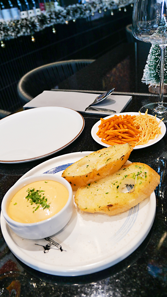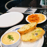 เมนูแนะนำของร้านเริ่มตั้งแต่ Garlic Bread หอมกรอบ ไปจนถึง Rocket Salad และ Caesar Salad ที่ให้รสสดชื่น ก่อนต่อด้วย Cheese Board สำหรับการจิบไวน์เพลิน ๆ Salmon Carpaccio และ Arrabbiata Soup ที่โด่ดเด่นด้วยรสชาติชัดเจน ปิดท้ายด้วย Salmon Steak และHotate Clear Soup ที่ให้ความละมุนเรียบง่าย แต่เปี่ยมด้วยรายละเอียด