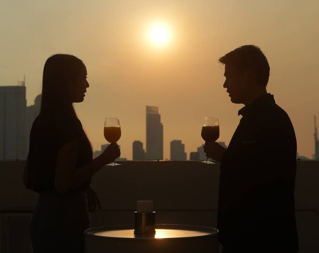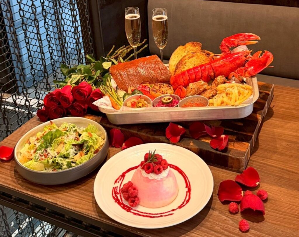 เริ่มต้นด้วยทาร์ทาร์แซลมอนรมควัน ซุปครีมเห็ดหอมกรุ่นทรัฟเฟิล ต่อด้วยล็อบสเตอร์แคนาดานึ่งเนย และสเต๊กเนื้อ Westholme Wagyu ส่วนสันนอก ปิดท้ายความหวานด้วย Dark & White Chocolate Mille-Feuille ของหวานสุดหรูที่ออกแบบมาเพื่อแบ่งปันกันอย่างโรแมนติก เติมเต็มบรรยากาศด้วยสปาร์กลิงไวน์ 2 แก้วต่อคู่ ขณะที่แสงไฟกรุงเทพฯ เปล่งประกายอยู่เบื้องล่าง