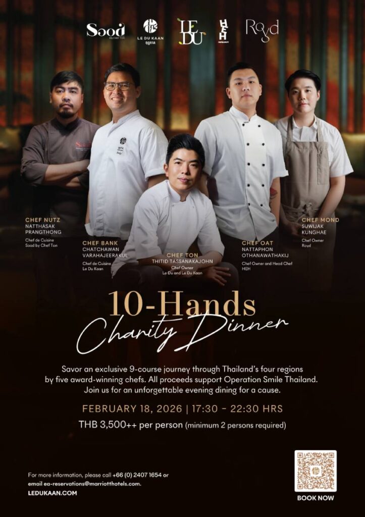 งาน 10-Hands Charity Dinner ท่ามกลางทัศนียภาพอันตระการตา ณ ร้านฤดูกาล ชั้น 56 ของเอ-ญ่า รูฟทอป แอท ดิ เอ็มไพร์ จะจัดขึ้นในวันที่ 18 กุมภาพันธ์ 2569 เวลา 17:30 – 22:30 น.  ราคา 3,500++ บาท ต่อท่าน (สำรองที่นั่งขั้นต่ำ 2 ท่านขึ้นไป) ที่นั่งมีจำนวนจำกัด รายได้ส่วนหนึ่งมอบให้แก่มูลนิธิสร้างรอยยิ้ม ประเทศไทย สำรองที่นั่งล่วงหน้าได้ที่ https://tinyurl.com/LDK7XPR สอบถามข้อมูลเพิ่มเติมหรือติดต่อผ่านช่องทางต่อไปนี้:
