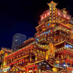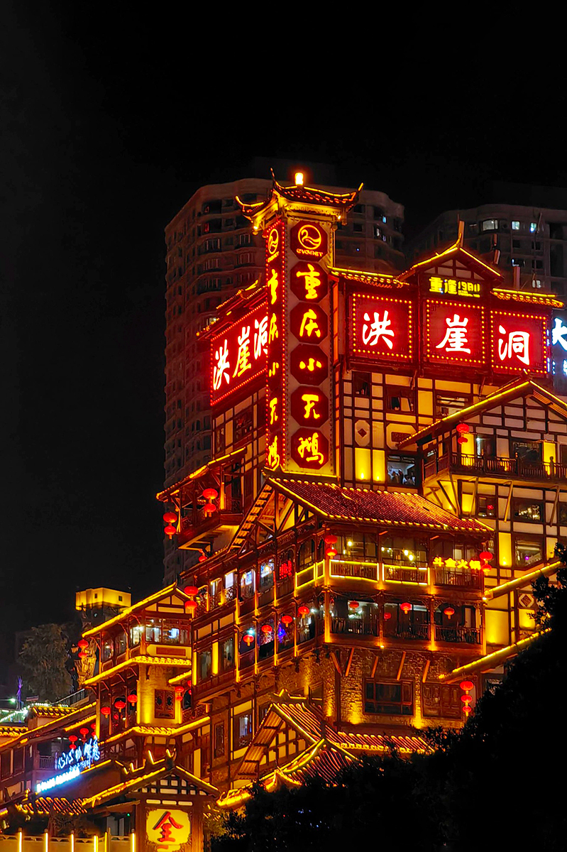 ย่านริมน้ำสไตล์เสาสูงที่สร้างเรียงรายตามหน้าผา หงหย่าตงสะท้อนทั้ง เสน่ห์ของอดีตและจังหวะชีวิตร่วมสมัย ตอนกลางวันเต็มไปด้วยร้านค้าและร้านอาหารแบบดั้งเดิม ส่วนยามค่ำคืนโคมไฟและแสงนีออนส่องสว่างสะท้อนบนแม่น้ำ ราวกับเมืองทั้งเมืองกำลัง เล่าเรื่องราวของฉงชิ่งผ่านแสงสีและสถาปัตยกรรม การเดินเล่นที่นี่ไม่เพียงชมวิว แต่ยังสัมผัสชีวิตท้องถิ่น ผสานบรรยากาศประวัติศาสตร์และความสนุกทันสมัยเข้าด้วยกัน