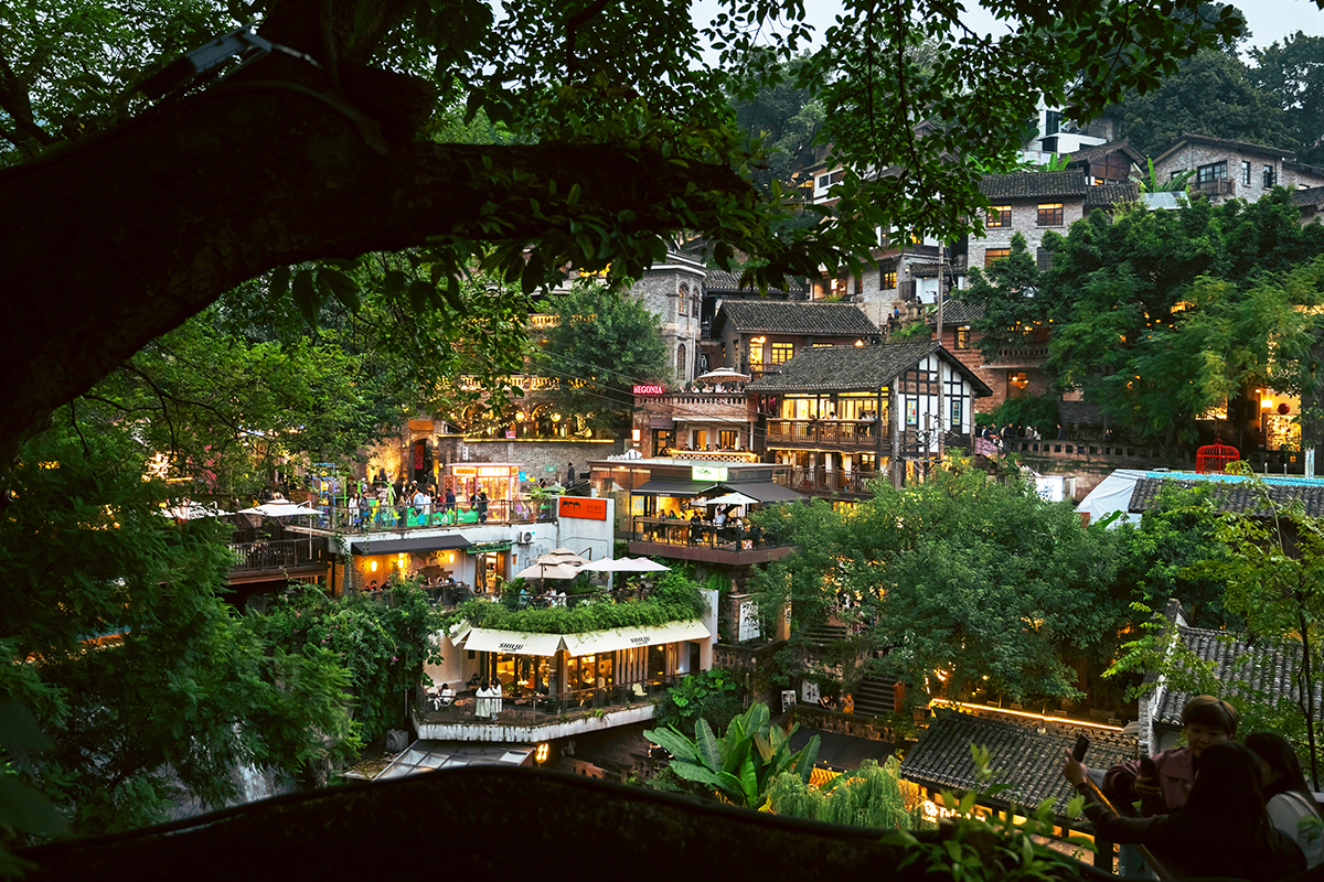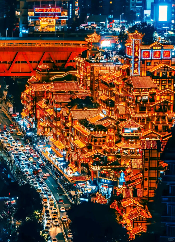 เมื่อค่ำคืนมาเยือน ริมน้ำของฉงชิ่งจะเปล่งประกายด้วยแสงไฟจากสะพานและตึกสูงที่สะท้อนลงบนผิวน้ำ เสียงดนตรี การแสดงริมทาง และเสียงหัวเราะของผู้คนที่ออกมาเดินเล่นสร้างบรรยากาศอบอุ่นแต่คึกคัก นี่คืออีกมุมหนึ่งของฉงชิ่งที่ผสานเสน่ห์ดั้งเดิมเข้ากับความร่วมสมัยได้อย่างกลมกลืน