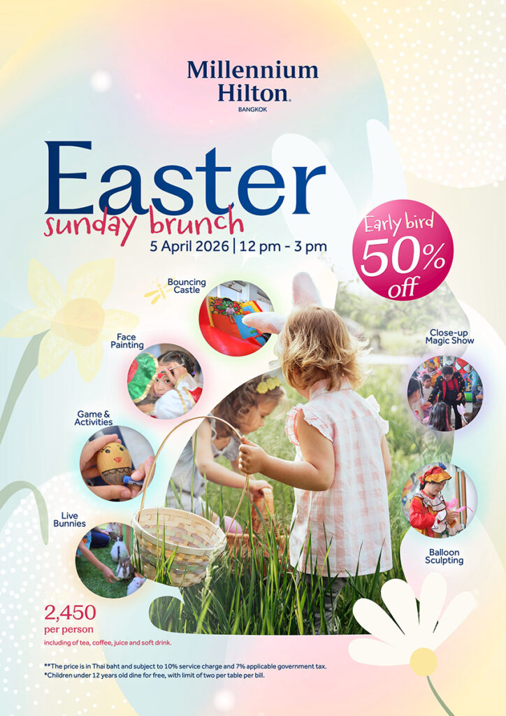 ฉลองเทศกาลอีสเตอร์ริมน้ำสุดอลังการ ณ โรงแรมมิลเลนเนียม ฮิลตัน กรุงเทพฯ เตรียมพบกับความสุขในวันอาทิตย์ที่ 5 เมษายน 2569 นี้ โรงแรมมิลเลนเนียม ฮิลตัน กรุงเทพฯ ขอเชิญทุกครอบครัวมาร่วมฉลอง อีสเตอร์ บรันช์ 2026 ท่ามกลางบรรยากาศคาร์นิวัลริมแม่น้ำเจ้าพระยาที่เต็มไปด้วยสีสัน โดยเราได้เนรมิตพื้นที่ริมน้ำให้กลายเป็น “ดินแดนมหัศจรรย์สำหรับคุณหนู ๆ” ควบคู่ไปกับบุฟเฟ่ต์ระดับ 5 ดาวสุดพรีเมียม อิ่มอร่อยไปกับบุฟเฟ่ต์นานาชาติ ณ ห้องอาหารโฟลว์ (FLOW) ที่ยกขบวนซีฟู้ดสดใหม่ สเตชันเนื้ออบเกรดพรีเมียม และมุมของหวานธีมอีสเตอร์สุดตระการตา พร้อมเพลิดเพลินกับดนตรีสดและทัศนียภาพอันงดงามของแม่น้ำเจ้าพระยา ซึ่งถือเป็นหนึ่งในประสบการณ์การรับประทานอาหารวันอีสเตอร์ที่ดีที่สุดในกรุงเทพฯ ที่สุดของอีสเตอร์สำหรับเด็ก – ประสบการณ์ Kids’ Wonderland:ความบันเทิงสุดพิเศษ: ตื่นตาตื่นใจกับมายากลแบบใกล้ชิด และการทำลูกโป่งแฟนซีกิจกรรมแสนสนุก: บริการเพ้นท์หน้าและบ้านลมขนาดใหญ่สัมผัสความน่ารัก: โอกาสใกล้ชิดและถ่ายรูปกับฝูงกระต่ายตัวน้อยกิจกรรมตามประเพณี: ตามหาไข่อีสเตอร์ (Easter Egg Hunt) เพื่อชิงรางวัลมากมาย สำหรับครอบครัวที่มองหาโปรโมชั่น “เด็กทานฟรี” ในเทศกาลอีสเตอร์ 2026 นี้ เรามอบสิทธิ์พิเศษให้เด็กอายุต่ำกว่า 12 ปี ทานฟรีทันที! เมื่อมาพร้อมผู้ใหญ่ 1 ท่าน ข้อเสนอสุดพิเศษ:Early Bird: รับส่วนลด 50% (เหลือเพียง 1,573 บาทสุทธิ) เมื่อจองภายในวันที่ 31 มีนาคมนี้โปรโมชั่นครอบครัว: เด็กอายุต่ำกว่า 12 ปี ทานฟรี! รายละเอียดกิจกรรม:วันที่: วันอาทิตย์ที่ 5 เมษายน 2569เวลา: 12:00 น. – 15:00 น.สถานที่: ห้องอาหารโฟลว์ (FLOW), โรงแรมมิลเลนเนียม ฮิลตัน กรุงเทพฯ สำรองที่นั่ง: https://qrcodes.pro/EasterBrunchLine@: https://qrcodes.pro/mhblineโทร: 02 442 2000