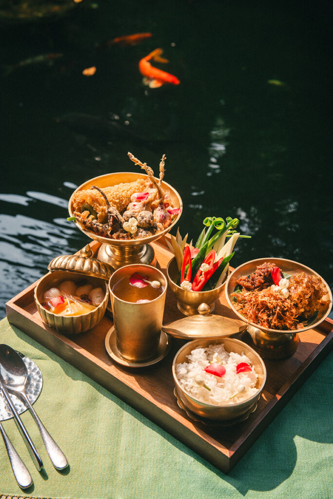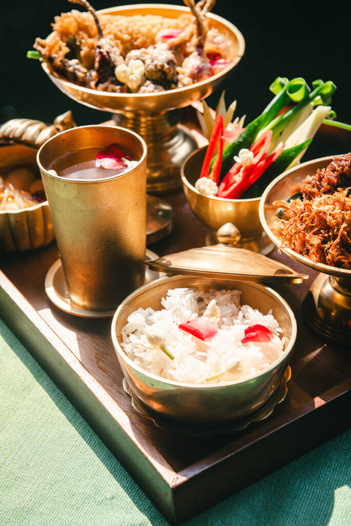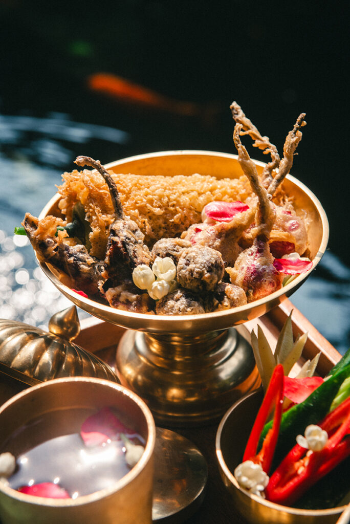 “ข้าวแช่ จิม ทอมป์สัน” นำเสนอข้าวหอมมะลิไทยที่นึ่งด้วยวิธีดั้งเดิม เสิร์ฟพร้อมน้ำลอยดอกไม้ออร์แกนิกในชามทองเหลืองอันงดงาม ข้าวแช่มาพร้อมเครื่องเคียง 7 ชนิด ได้แก่ ลูกกะปิชุบไข่ทอด ที่คั้นจากกะปิคุณภาพดีผสมสมุนไพรไทยหอมกรุ่น ไชโป๊วหวาน ทำจากหัวไชเท้าเชื่อมด้วยน้ำตาลมะพร้าวจนเคลือบเงาสวยงาม พริกหยวกสอดไส้ห่อไข่ลูกไม้ ยัดไส้หมูคุโรบุตะและกุ้งผสมสมุนไพร ห่อด้วยไข่ลูกไม้ออร์แกนิก ปลายัดไส้หอมแดง ใช้หอมแดงคัดพิเศษยัดไส้ปลาช่อนแดดเดียวปรุงรส หมูฝอย ทำจากเนื้อหมูฉีกปรุงด้วยน้ำตาลมะพร้าวท้องถิ่นและน้ำปลา พริกแห้งไส้ปลาหวาน พริกชี้ฟ้าแห้งยัดไส้ปลาแดดเดียวปรุงรสหวาน นำไปชุบแป้งทอดสีทอง และ ปลายี่สนหวาน ปรุงอย่างพิถีพิถันด้วยซอสหวานที่ดึงเนื้อสัมผัสนุ่มกำลังดีของปลาออกมาได้อย่างลงตัว นอกจากนี้ยังเสิร์ฟผักและผลไม้แกะสลัก อาทิ มะม่วงมัน แตงกวา กระชาย และพริกชี้ฟ้าสด ปิดท้ายด้วยของหวานซิกเนเจอร์อย่าง ส้มฉุนลูกหม่อนลิ้นจี่มะยงชิด เติมกลิ่นหอมด้วยผิวส้มซ่า ดอกมะลิออร์แกนิก พร้อมเติมความหวานสดชื่นด้วยไซรัปดอกไม้ออร์แกนิก