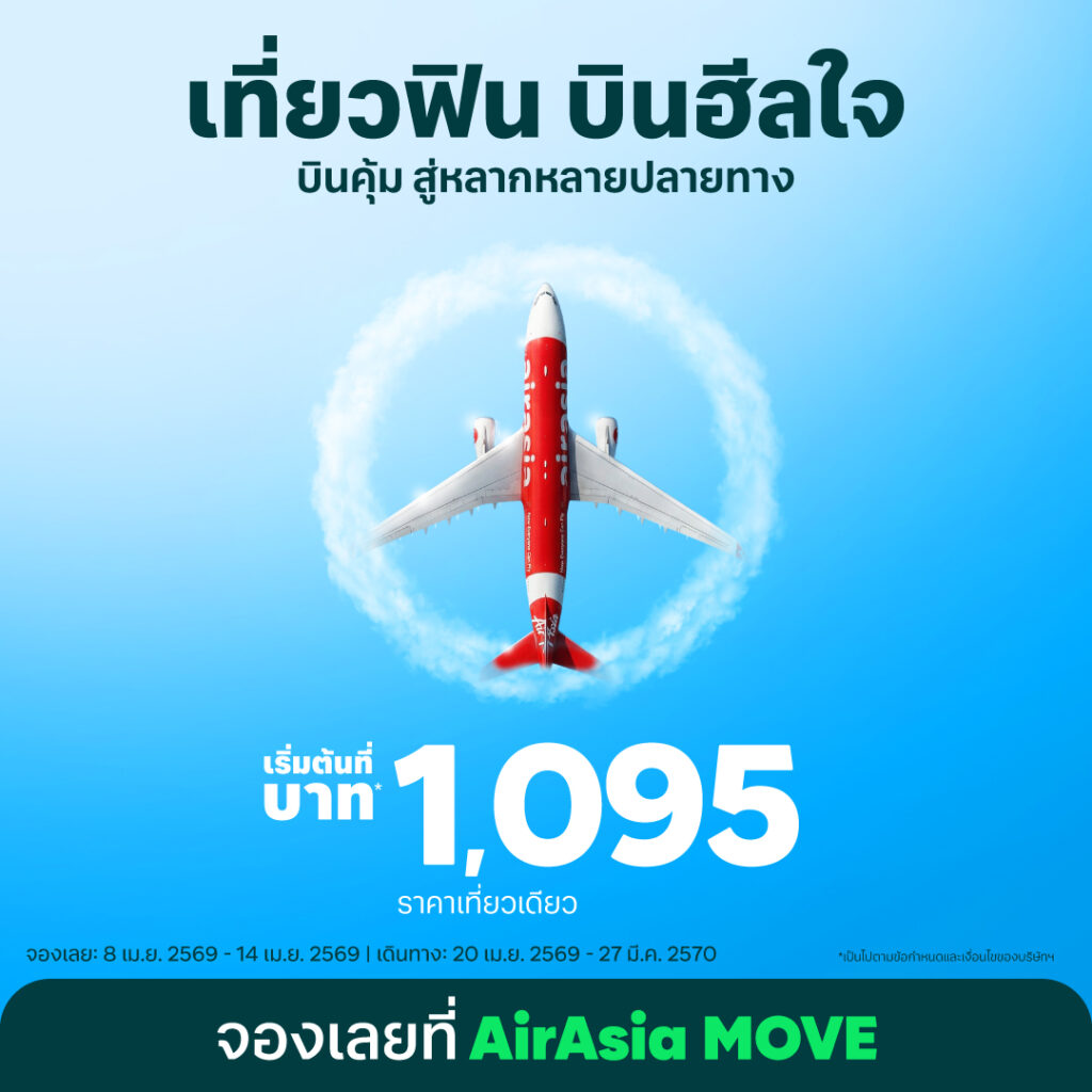 แอร์เอเชียชวนเที่ยวฟิน บินฮีลใจ ออกเดินทางท่องเที่ยวสู่หลากหลายจุดหมายปลายทาง ด้วยบัตรโดยสารราคาพิเศษ ในราคาที่ใครๆ ก็บินได้ ราคาเริ่มต้นที่ 1,095 ต่อเที่ยวบิน สำหรับเส้นทางภายในประเทศและราคาเริ่มต้นที่  1,900  ต่อเที่ยวบิน สำหรับเส้นทางระหว่างประเทศ เริ่มจองได้ตั้งแต่วันที่ 8 – 14 เมษายน 2569 เพื่อใช้เดินทางตั้งแต่วันที่ 20 เมษายน 2569 – 27 มีนาคม 2570 ที่ AirAsia MOVE