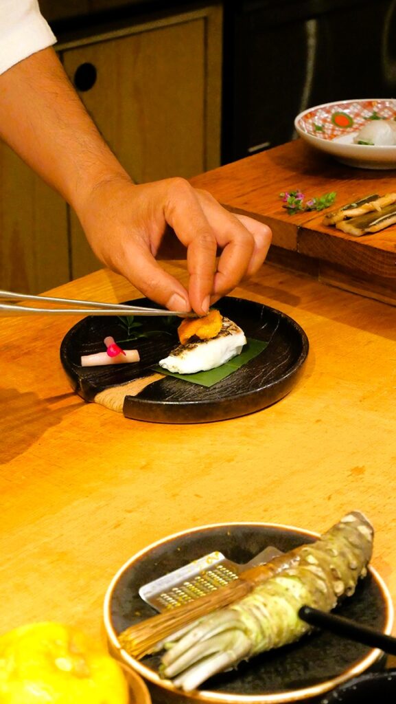 แต่ละเมนูล้วนถูกรังสรรค์ให้แตกต่างออกไปตามฤดูกาลและวัตถุดิบในแต่ละวัน ตั้งแต่ปลาขาวเนื้อละเอียด ไปจนถึงปลามันรสลึก ทุกคำสะท้อนความเข้าใจอย่างลึกซึ้งในธรรมชาติของวัตถุดิบและประสบการณ์ของเชฟ โดยไม่จำเป็นต้องพึ่งพาซอสหรือเครื่องปรุงที่เกินความจำเป็น